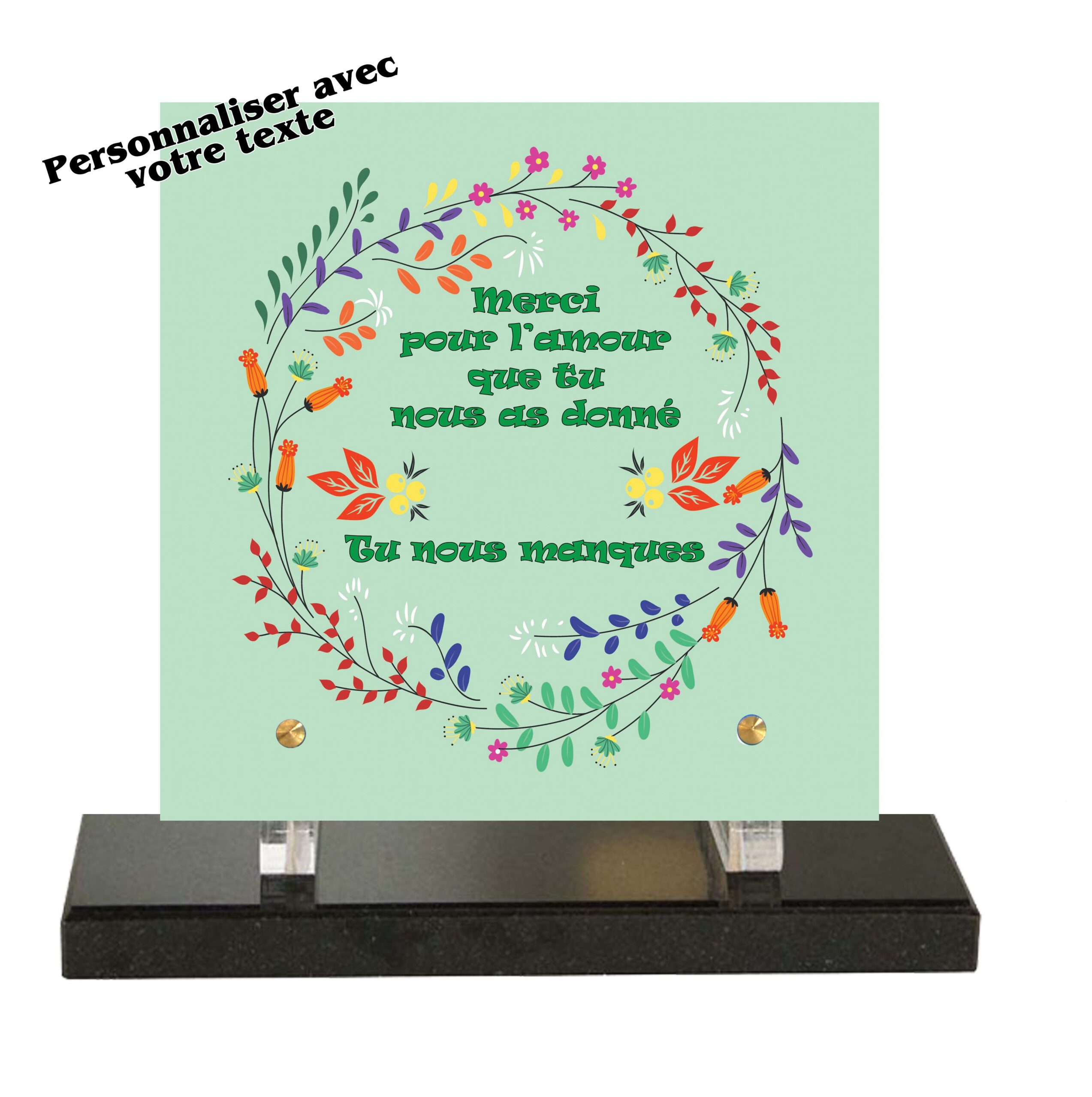 Plaque funéraire en plexiglass. Elle est décorée avec une impression numérique en couleur et un texte que vous pouvez personnaliser.